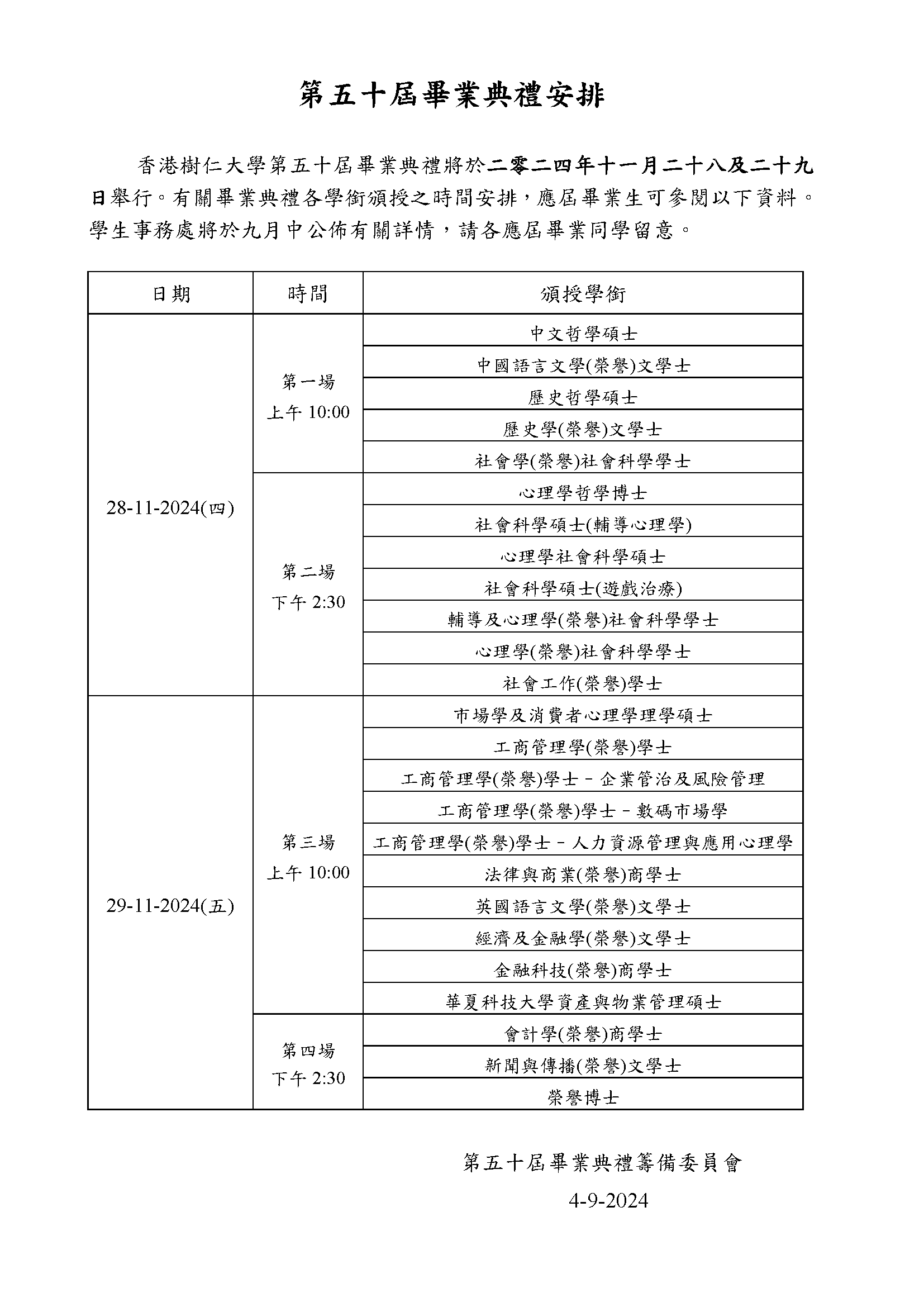 畢業典禮 校歌獻唱 日期:2,3/12(星期二、三) 時間:10:00am(上午場),2:30pm(下午場) 地點:邵美珍堂 津貼:將會提供學生助理津貼以茲鼓勵,每場$100 名額:15個 (額滿即止) 上午場集合時間:8:45am 下午場集合時間:1:45pm 集合地點:RLB401(琴房) 服飾要求:正裝 (formal dressing),上身白色襯衫,下身黑色西褲/西裙,黑色皮鞋,另校方會提供黑色禮袍 負責訓練:基督徒團契 獻唱曲目:《樹仁大學校歌》(校歌連結:按此聽歌) 歌曲語言:中文歌詞,普通話唱 歌詞 (將於練習時提供樂譜): 南海之隅,香島之濱,地靈人傑,東西文化共氤氳。 薈萃英賢,創立樹仁,傳道授業,研究學術,精於勤。 春風化雨,培育精神,美玉需磨琢,努力趁青春! 不為己,但為群,犧牲小我,達成博愛; 不負母校樹仁,莫忘母校樹仁。